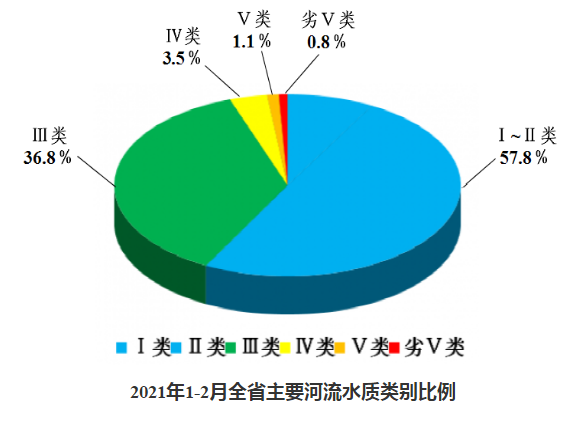 2021年1-2月,全省主要流域375個(gè)水質(zhì)評(píng)價(jià)斷面總體水質(zhì)為優(yōu)。Ⅰ~Ⅲ類(lèi)水質(zhì)比例為94.6%,同比上升3.3個(gè)百分點(diǎn);Ⅰ~Ⅱ類(lèi)水質(zhì)比例為57.8%,同比下降1.3個(gè)百分點(diǎn)。各類(lèi)水質(zhì)比例如下:Ⅰ類(lèi)占8.1%,Ⅱ類(lèi)占49.7%,Ⅲ類(lèi)占36.8%,Ⅳ類(lèi)占3.5%,Ⅴ類(lèi)占1.1%,劣Ⅴ類(lèi)占0.8%。